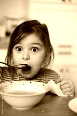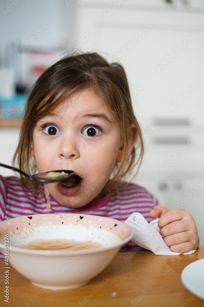 Close up of preschool girl portrait with funny expression eating soup at home