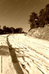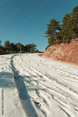 Bending mountain road with snow among the pine trees.