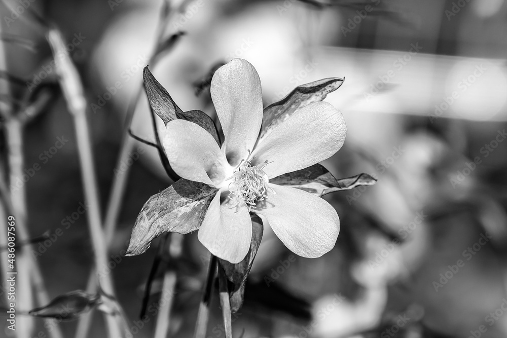 Aquilegia flower in the garden. Beautiful columbine in bright sunlight. Black and white photography.