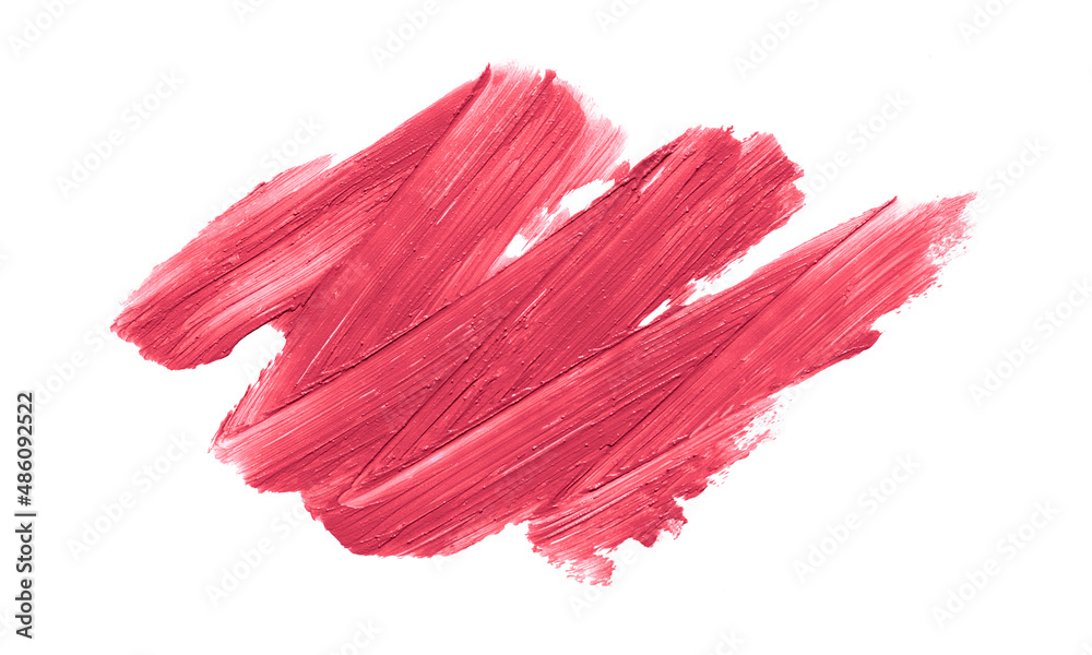 Smudged red lipstick cream texture or acrylic color brush stroke on white background. Beauty and make up concept