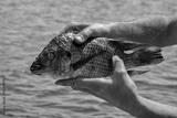 Tilapia fish is held by a fisherman in his hands against the background of water.