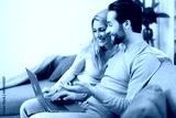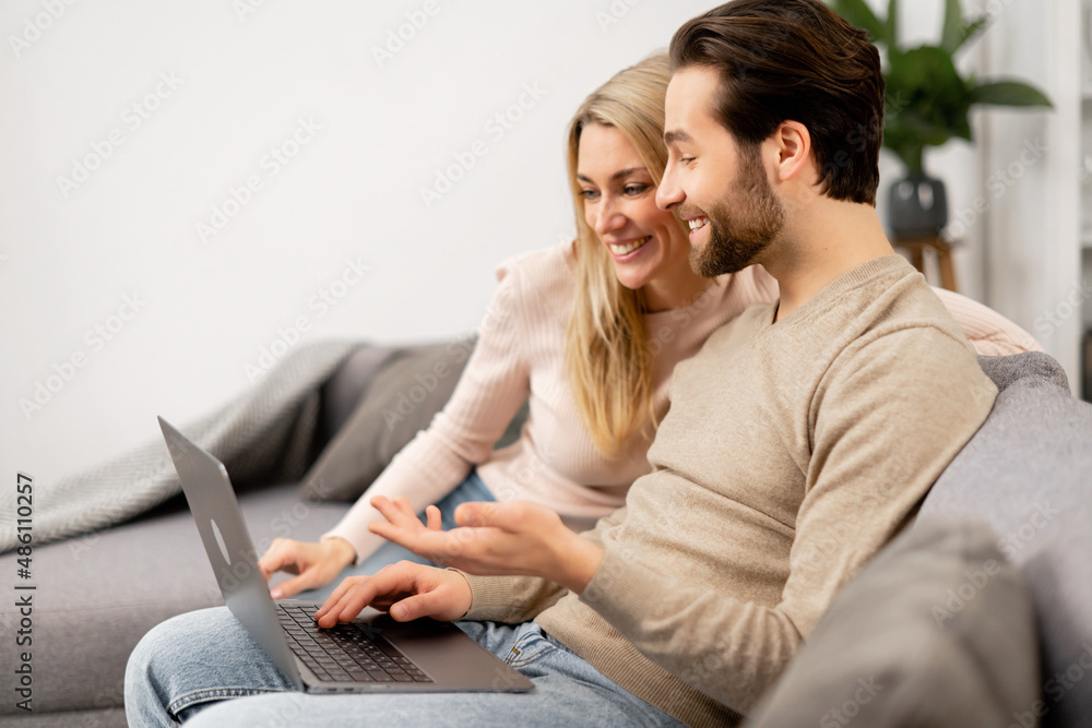 Happy girlfriend and her boyfriend looking at the laptop screen while sitting on the sofa, watching movies. Caucasian couple in love spending leisure time with laptop at home