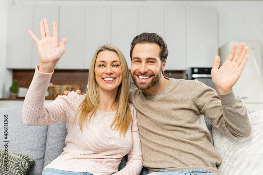 Video screen with cheerful caucasian couple looking at the camera and waving. Webcam view of smiling woman and her man sitting on the couch and greeting. Virtual meeting concept