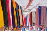 Colorful handmade scarves lined up on a rope hanger in woman producer bazaar in Odemis, Izmir. Many or lots of different beautiful modern style needlework or needle lace scarves hanging on a rope.