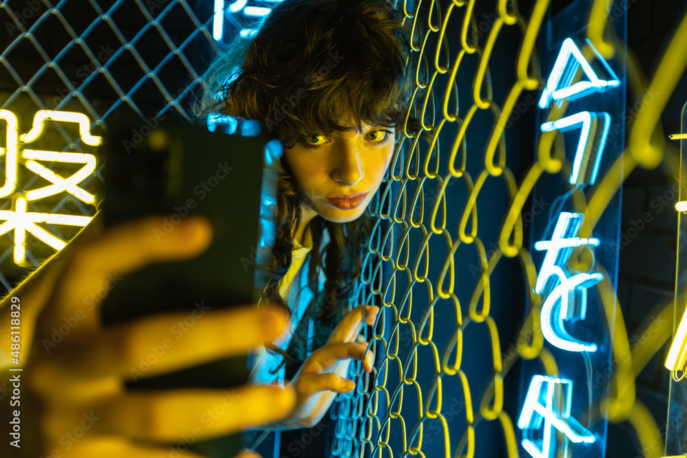 A young woman with curly hair takes a selfie near a yellow metal grid and in neon lighting.