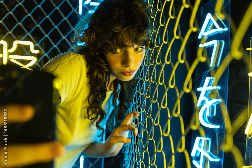 A young woman with curly hair takes a selfie near a yellow metal grid and in neon lighting.