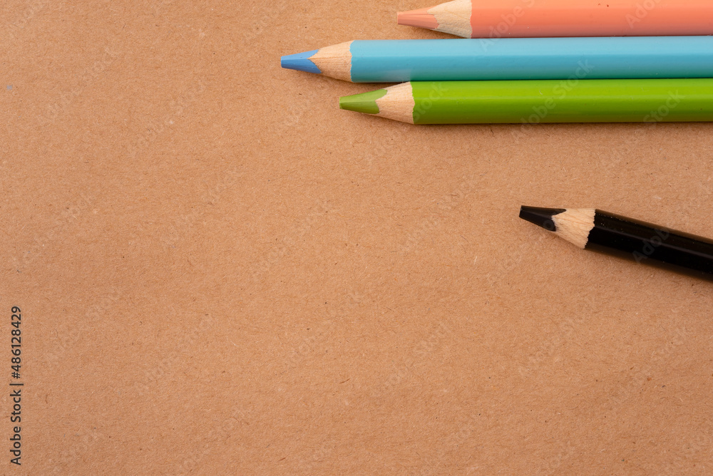 School, education and art concept with colorful pencils on natural recycled paper background.