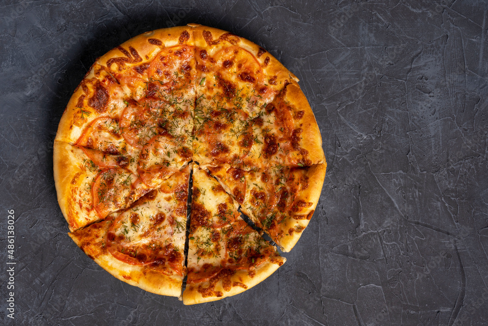 Delicious warm pizza on a gray-black background. Top view of a delicious baked hot pizza