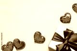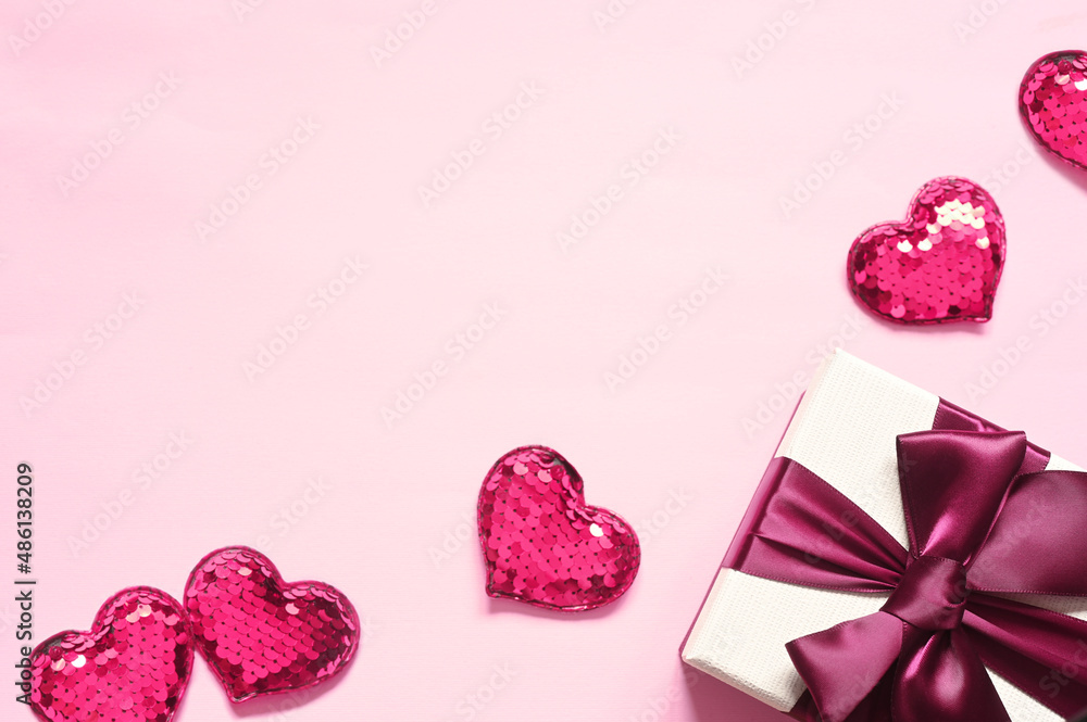 Top view photo of valentine's day decorations. White gift box and small hearts on isolated pink background.