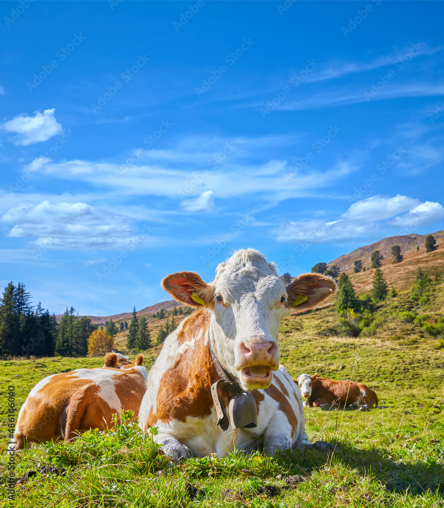 Schöne Bergimpressionen mit Kühen beim wiederkäuen, oberhalb von Wald im Pinzgau, in Österreich.