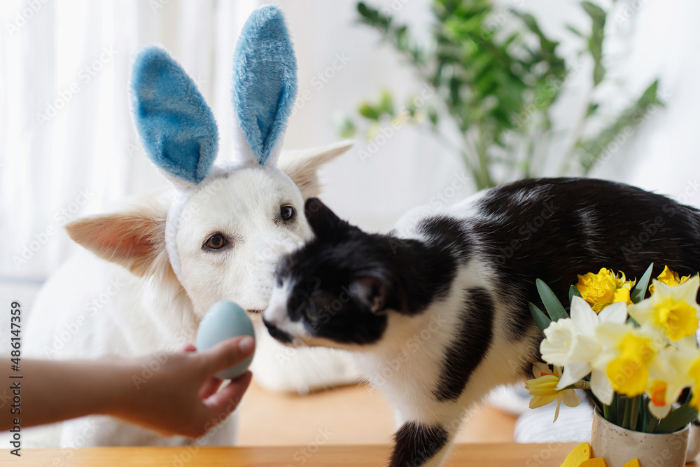 Cute dog in bunny ears and cat looking at stylish easter egg in woman hand. Happy Easter. Pets and easter holiday at home