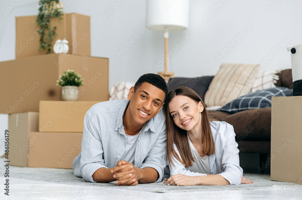 Happy couple in love, a latino guy and a caucasian girl, lie on the floor in the living room, moved to their new home, on the background are cardboard boxes, spouses look at the camera, smile joyfully