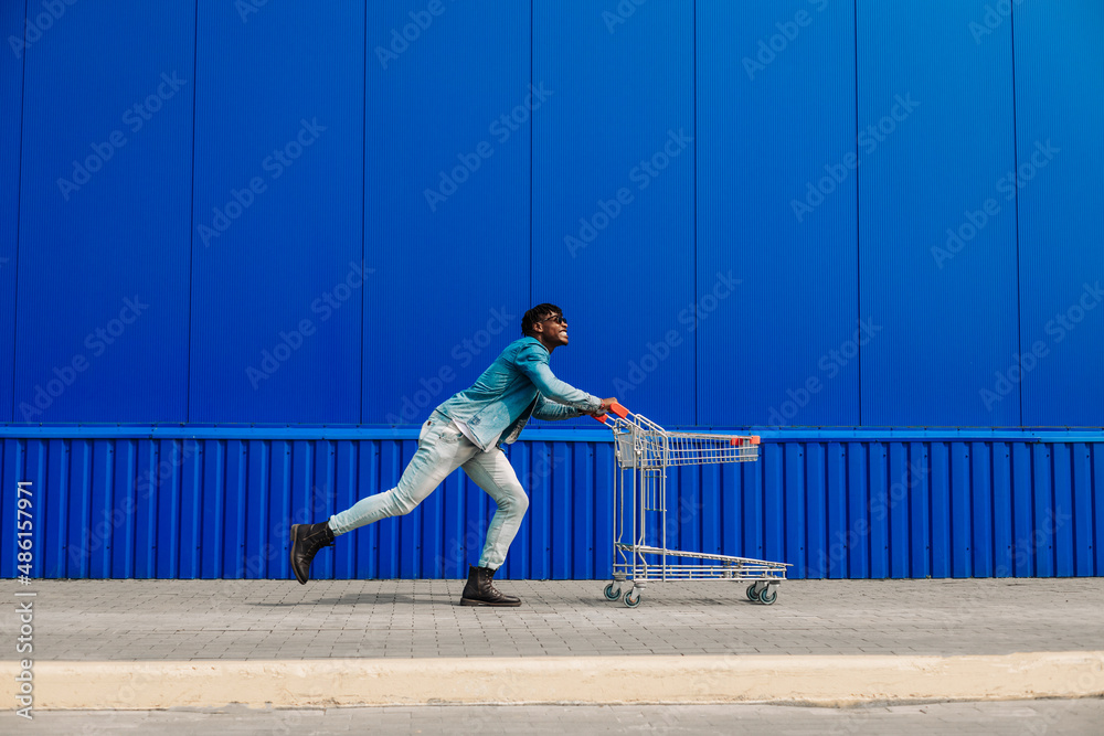 Excited happy african american man having fun while shopping, man pushing shopping cart while shopping in mall