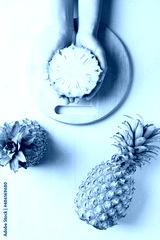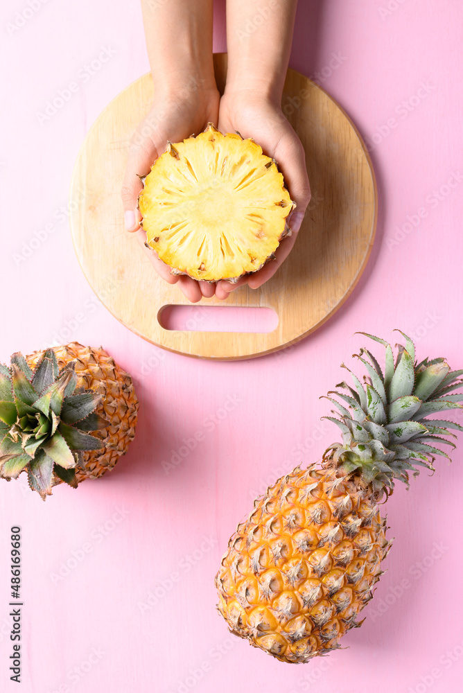 Fresh pineapple fruit holding by hand on pink background, Tropical fruit, Top view