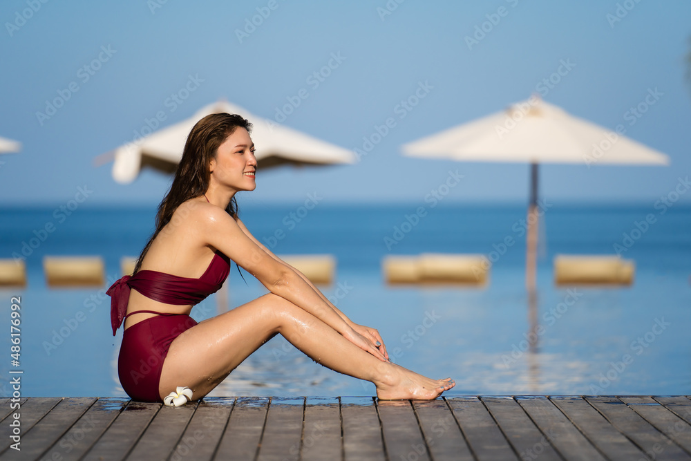 woman in swimsuit sitting on wooden edge of swimming pool with sea background