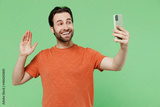 Young fun man 20s wear orange t-shirt doing selfie shot on mobile cell phone post photo on social network waving hand say hello isolated on plain pastel light green color background studio portrait