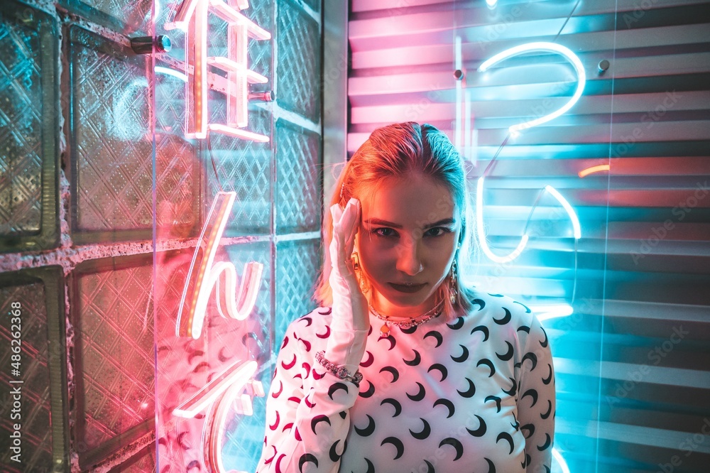 Silhouette of a young woman posing in a room with a neon lamp. Slender modern model in a beautiful pose on a purple-blue background with airbrushes