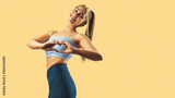 Beautiful fitness girl posing and showing heart with hands. Healthy body concept.