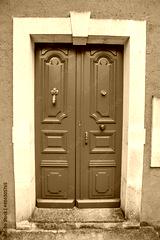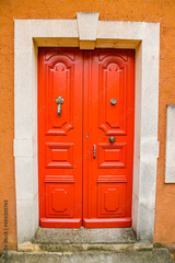 Red door of an old house in the village of Roussillon in the Luberon valley in Provence, France
