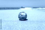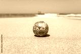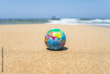 Toy globe on the sand of beach with sea wave background. World travel concept.