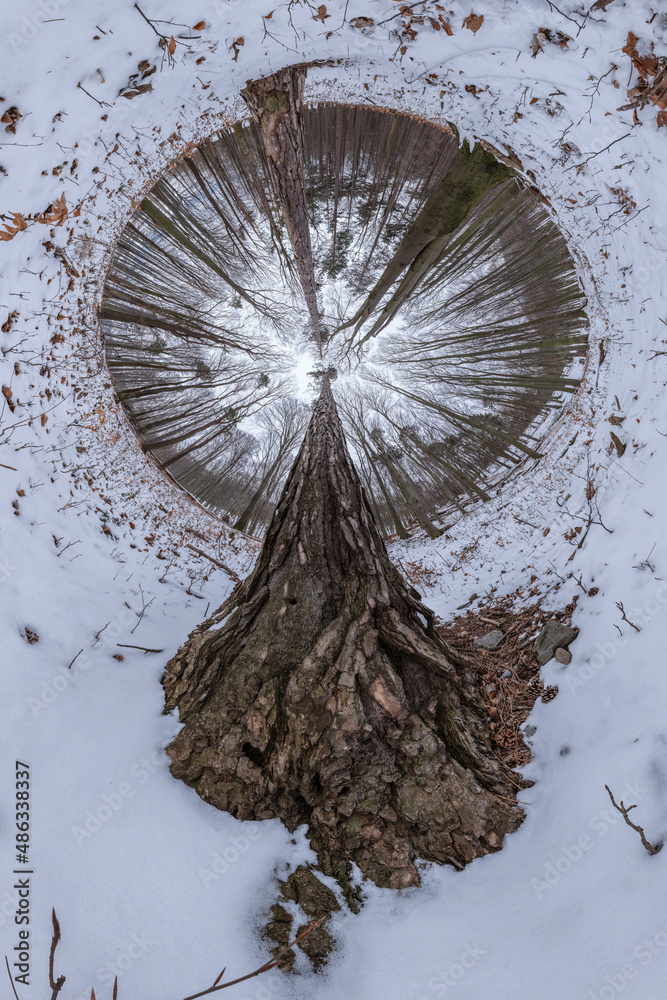 360 degree panorama in the winter pine and beech forest with a dominant tree