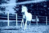 white horse running in training field