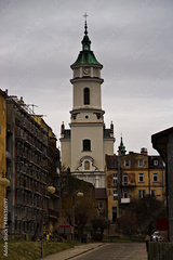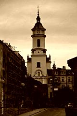 Ostrowiec Świętokrzyski. Uliczka rodzinnego miasta ze starą zabudową. Zabytkowe kamienice, kościół ( Dom Boży ). A lane of his hometown with old buildings. Historic church houses (House of God).