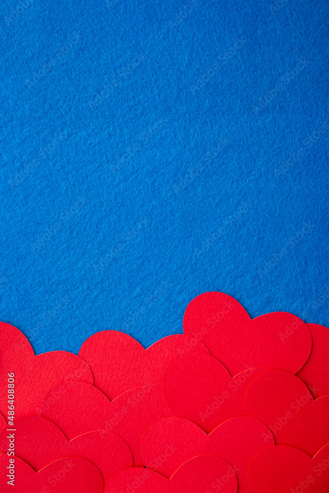 Paper cut red hearts shape on blue textured background with copy space. Concept image. Valentine's day, mother's day, birthday greeting cards, invitation, celebration