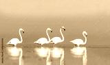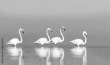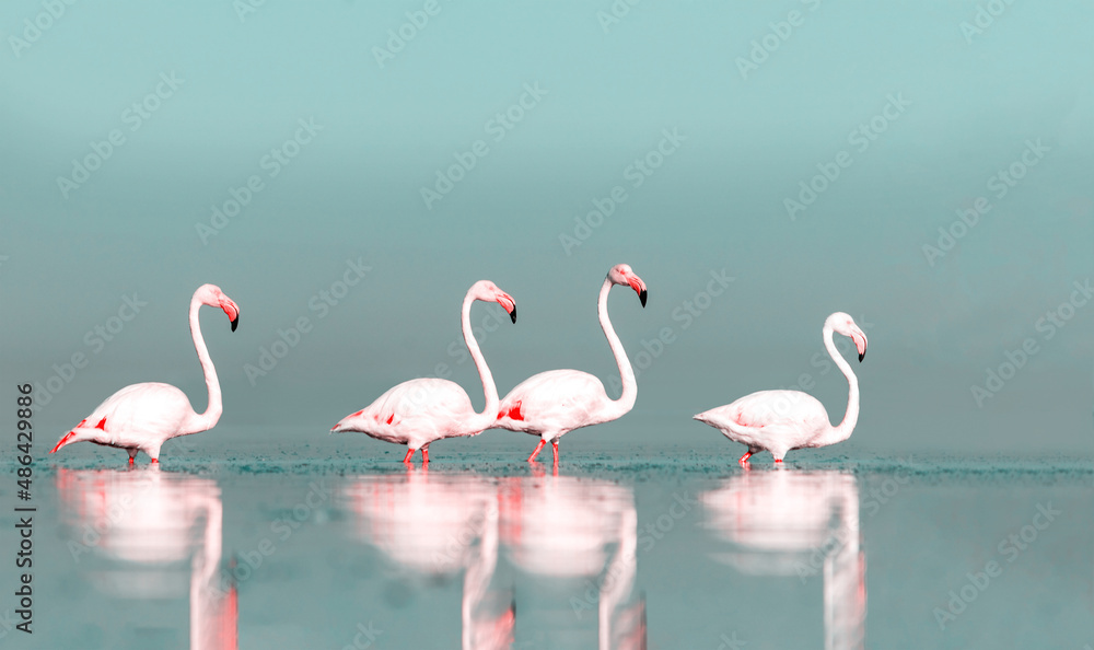 Wild african birds. Group birds of pink african flamingos walking around the blue lagoon on a sunny day.