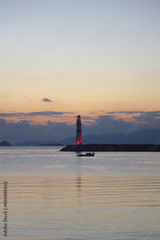 Seascape at sunshine. Lighthouse and sailings on the coast. Seaside town of Turgutreis and spectacular sunshine