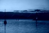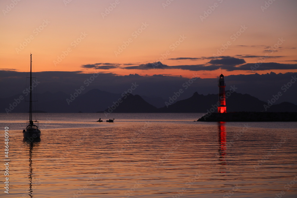 Seascape at sunshine. Lighthouse and sailings on the coast. Seaside town of Turgutreis and spectacular sunshine
