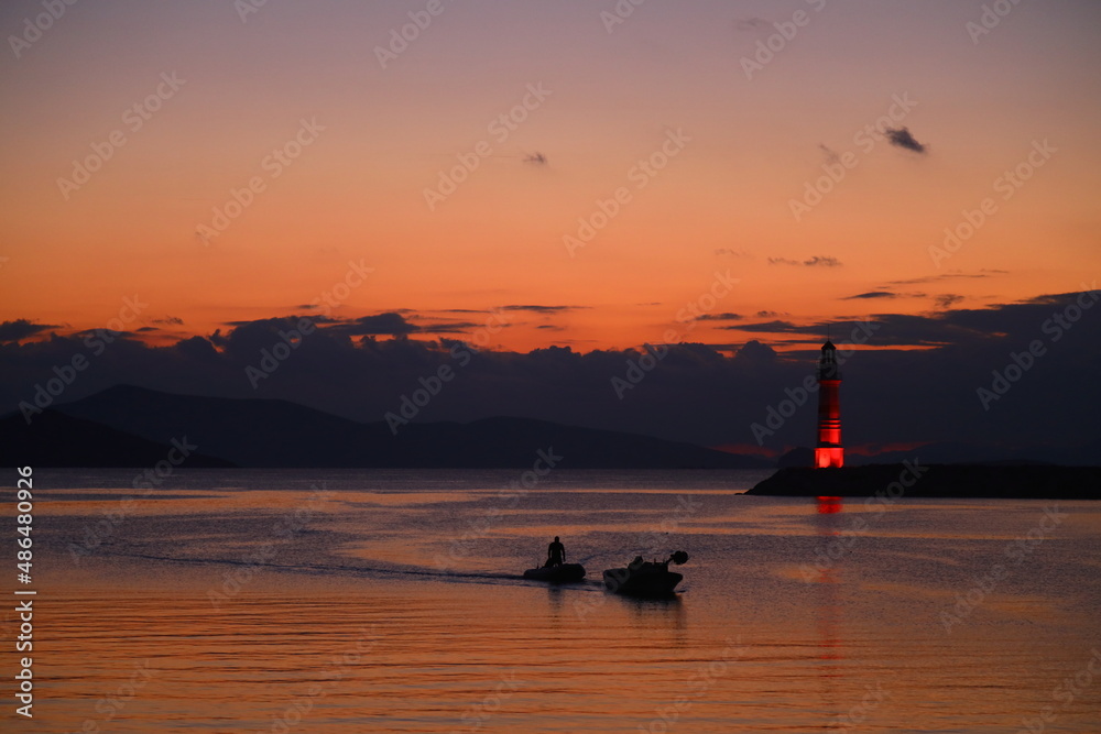 Seascape at sunshine. Lighthouse and sailings on the coast. Seaside town of Turgutreis and spectacular sunshine