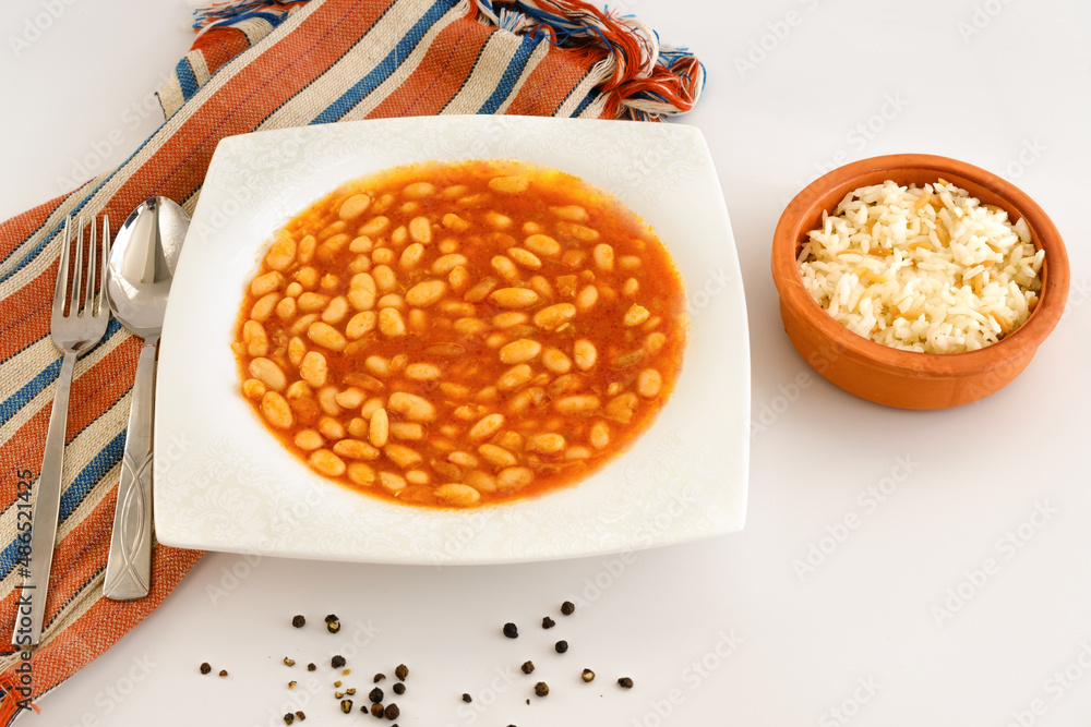 Traditional Turkish food: Kuru Fasulye and Pilav or Haricot Bean and Rice on white background. Meal presentation with popular traditional food of Turkey and Middle East.