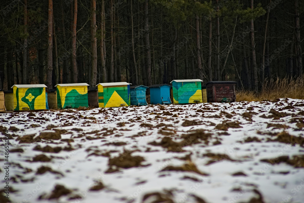 Pole pokryte śniegiem na skraju którego na łące , pod lasem, zimują ule z pszczołami . A field covered with snow on the edge of which on the meadow, under the forest, winter with bee houses..
