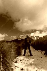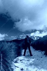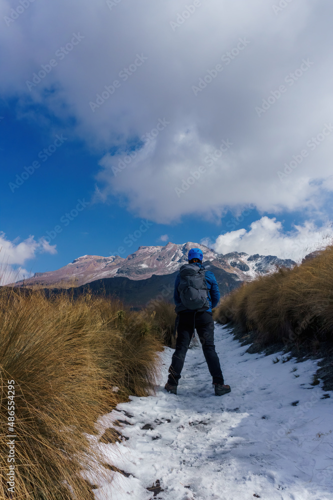 male hiker with backpack hiking mountain in winter on sunny day