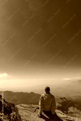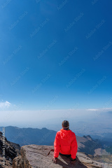 A young cheerful girl in a helmet, sits on the top of the mountain higher than clouds