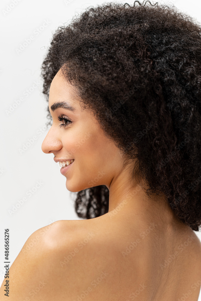 Close-up portrait of naked lady looking aside and smiling dreamy. Well-looking serene brunette woman with smooth pure skin over white background