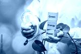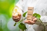 A woman holding a light bulb with green leaves in her hands and wooden blocks Green, energy, Power, ecological system, green energy, natural sources of electricity, creative