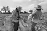 male Corn Farmer is collecting corn harvest into sacks