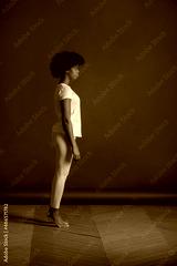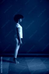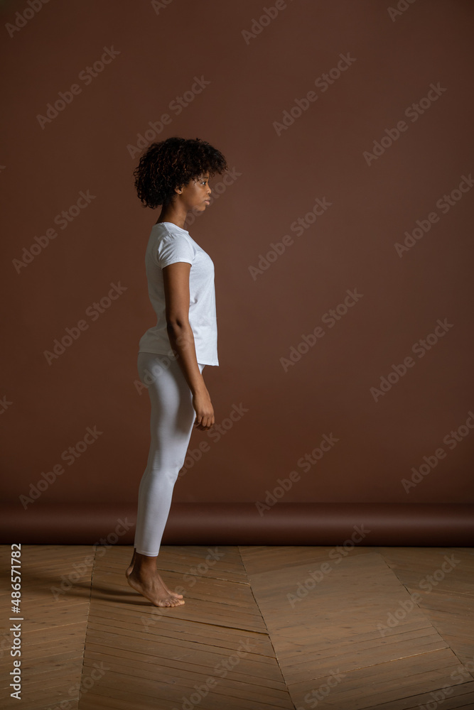 African American girl in a white T-shirt and leggings. Mock-up.