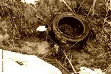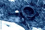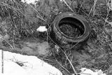Random garbage junk items left in nature. Old tire in the ditch on winter day.