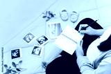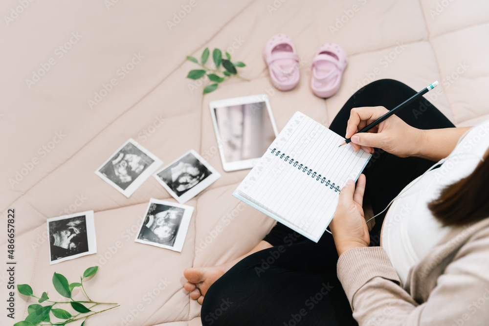 A Pregnancy dairy.Top view of pregnant woman writing thoughts down in notebook for memory,x-ray image of her baby and shoes.Concept of pregnancy, Maternity prenatal care.