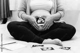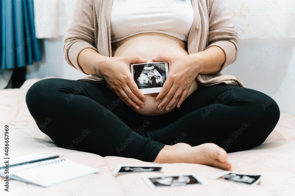 A Pregnant woman in dress with ultrasound image. Expectant mother waiting and preparing for baby birth during pregnancy.