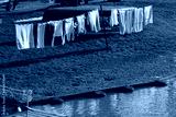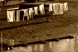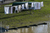 Clothesline with drying laundry in front of boats on the banks of the river Trave in the old town of the Hanseatic city Lubeck in Germany, copy space, selected focus
