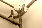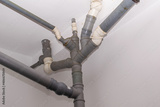tangle gray sewer pipes on a white wall
