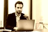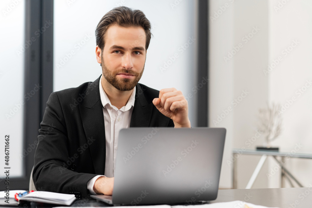 Glad male entrepreneur looking at the camera. Cheerful caucasian man wearing formal wear sitting at the table and using laptop at modern office