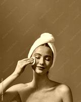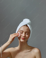 Beautiful young girl with towel on head hold cotton pad cleansing face skin remove makeup, enjoy skincare beauty routine