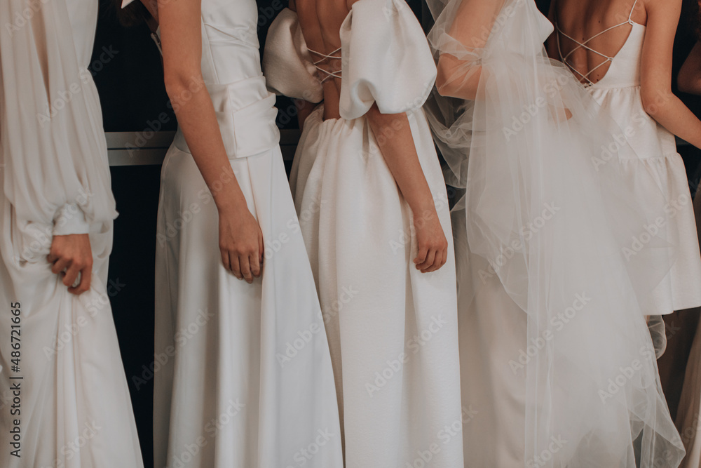 Female figures dressed in elegant white wedding dresses