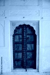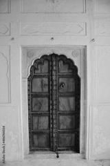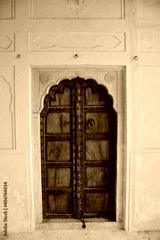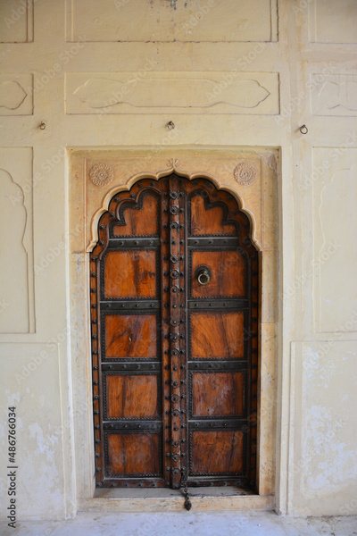 Traditional ornamental wooden door in Amber Fort, Mughal palace in Jaipur, India