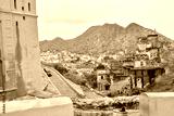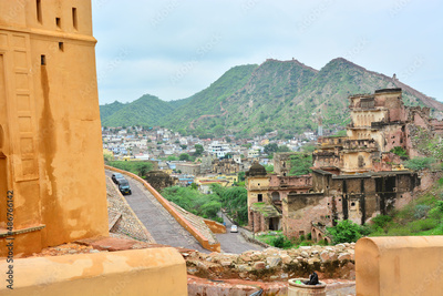 Amer, near Jaipur, in Rajasthan, India - View from Amber Fort at the road, town and mountains